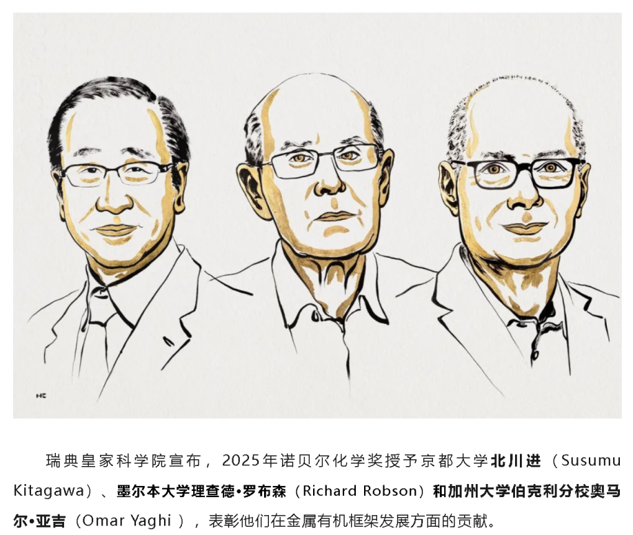 2025 年,瑞典皇家科学院把诺奖颁给了三位研究 MOF 的科学家:京都大学的北川进(Susumu Kitagawa)、墨尔本大学的理查德・罗布森(Richard Robson),还有加州大学伯克利分校的奥马尔・亚吉(Omar Yaghi)。他们厉害在哪?以前超分子组装只能弄出零维的 “小笼子”、一维的 “小链条”,他们却搞出了三维的、硬挺的、带孔的框架结构 —— 这框架的孔道大小、功能都能 “定制”,想要啥样就设计啥样,MOF 材料这下彻底 “灵活起来” 了。